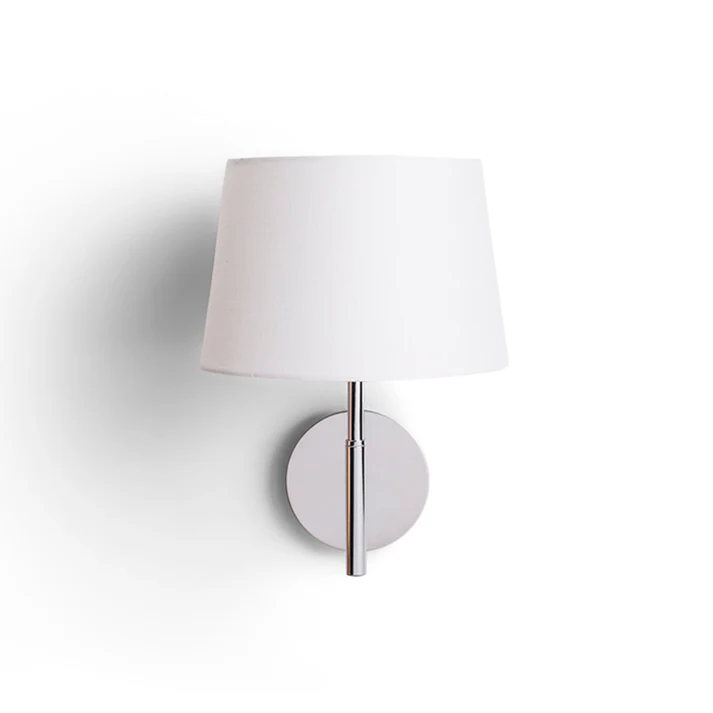 Aplica de perete Rendl Brodway este realizată cu abajur textil alb pe bază metalică finisată crom, având un design clasic și elegant, potrivită pentru dormitoare și zone de relaxare. Este echipată cu întrerupător tip toggle switch pentru o utilizare practică. Dimensiuni: Ø 235 × H 325 mm. Compatibilă cu surse de lumină LED E27, putere maximă 15W. Greutate 1300 g. Disponibilă în finisaj: alb / crom.