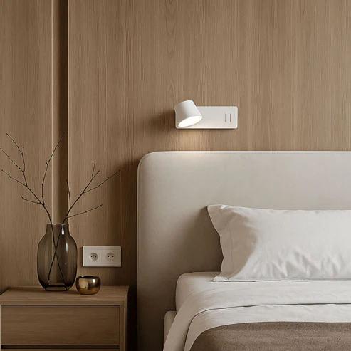Aplica de perete Amadeus este echipată cu sursă LED integrată și reflector rotativ, oferind atât iluminare indirectă, cât și focalizată într-o singură direcție. Reflectorul și lumina indirectă sunt controlate independent prin întrerupătoare separate amplasate pe bază. Dimensiuni: L 220 × H 80 × P 100 mm, Ø 90 mm. Putere 4W, flux luminos 735 lm, lumină alb caldă (3000K). Unghi de rotație reflector 350°. Greutate 732 g. Grad de protecție IP20. Disponibilă în finisaje: alb și negru.
