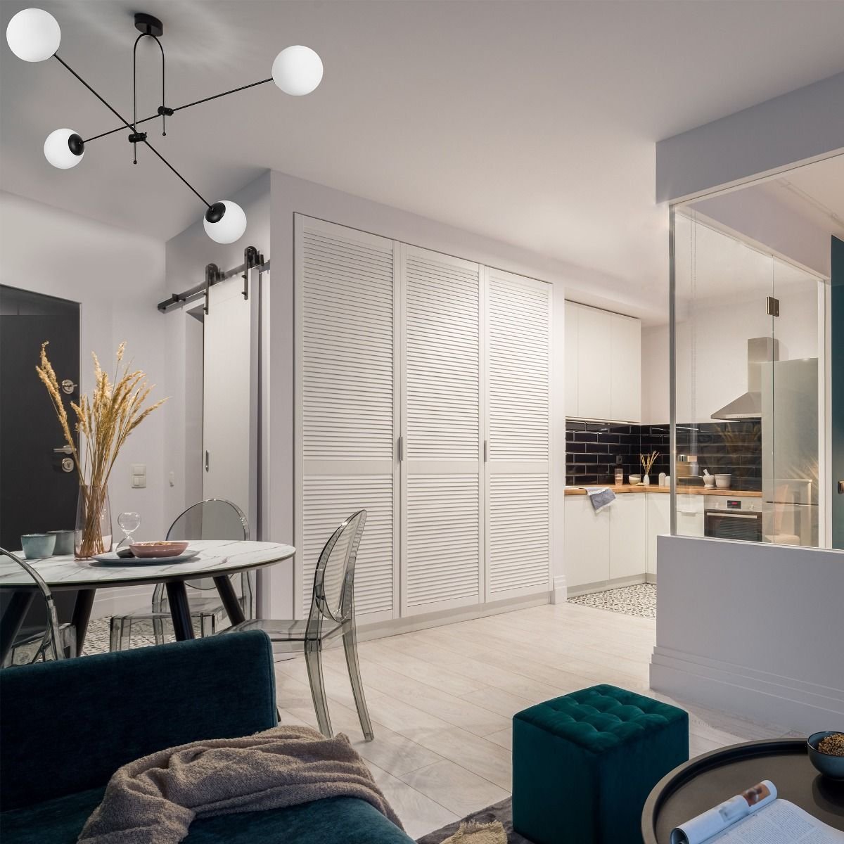 Lustră modernă pentru interior, cu 4 surse de iluminare, realizată din metal și sticlă, ideală pentru livinguri sau spații contemporane ample.