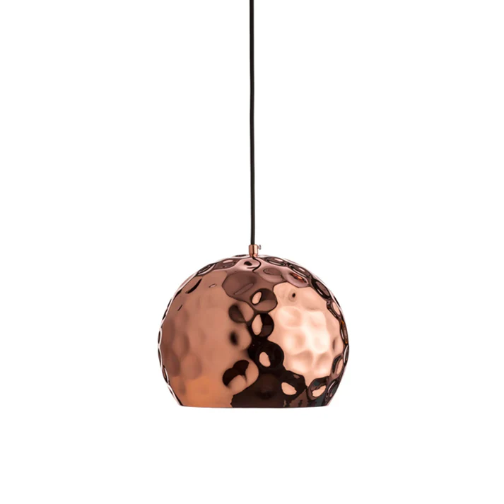 Pendulul Blondie se remarcă prin abajurul metalic cu finisaj tip „lovitură de ciocan”, care creează un efect vizual sofisticat și rafinat. Exteriorul din cupru contrastează elegant cu interiorul vopsit în alb, reflectând lumina într-un mod plăcut și uniform. Corpul este echipat cu dulie E27, compatibilă cu surse LED de până la 15W, inclusiv variante dimmable ce permit ajustarea intensității luminoase. Suspensia de 140 cm oferă flexibilitate la montaj, fiind ideal pentru iluminarea meselor de dining, a insulelor de bucătărie sau a spațiilor de tip lounge. Cu o greutate de 920 g, pendulul Blondie combină robustețea metalului cu un design decorativ de impact, aducând un accent premium în orice interior modern. Dimensiuni: Ø25 × H 20 cm, suspensie 140 cm
