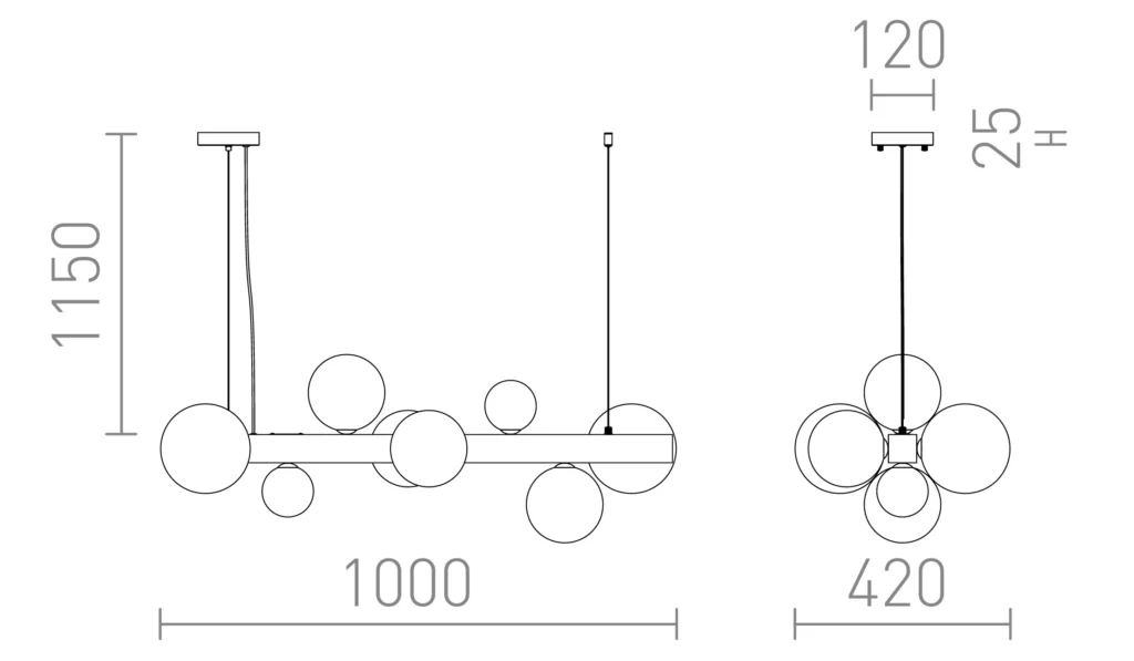 Pendulul KASSANDRA este o piesă de design spectaculoasă, ce îmbină eleganța sticlei opal cu rafinamentul finisajului bronz periat. Cele opt abajururi rotunde, realizate din sticlă mată în trei dimensiuni diferite, sunt dispuse armonios pe o prismă metalică, creând un efect vizual sofisticat și modern. Compatibil cu surse de lumină LED G9, acest corp asigură o iluminare plăcută și uniformă, ideală pentru livinguri, zone de dining sau spații de socializare cu personalitate. Suspensia ajustabilă până la 115 cm permite integrarea ușoară atât în interioare cu tavane standard, cât și în încăperi ample. Cu o greutate de 3250 g, pendulul impresionează prin robustețe și calitatea execuției, fiind o alegere inspirată pentru cei care caută un corp de iluminat decorativ cu impact vizual și funcționalitate ridicată. Dimensiuni: L 99 × H max. 115 cm.