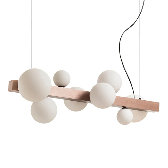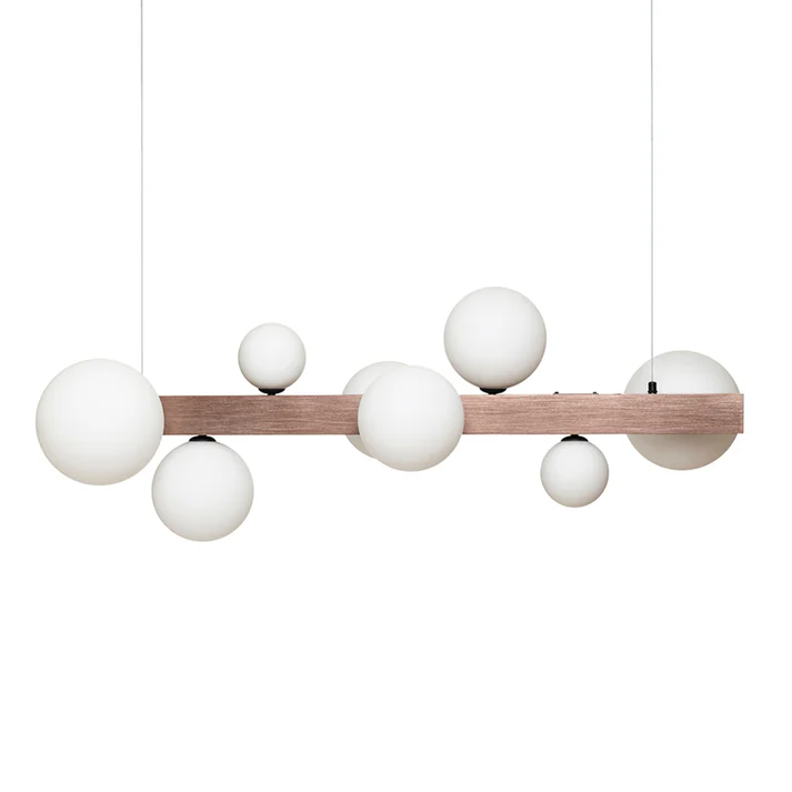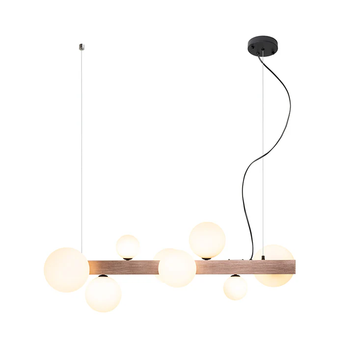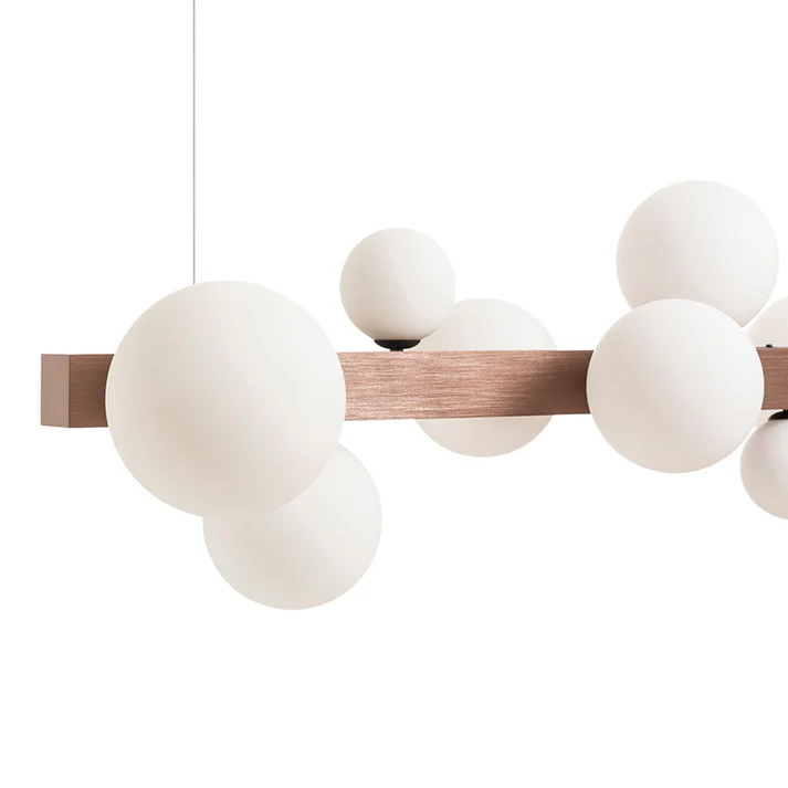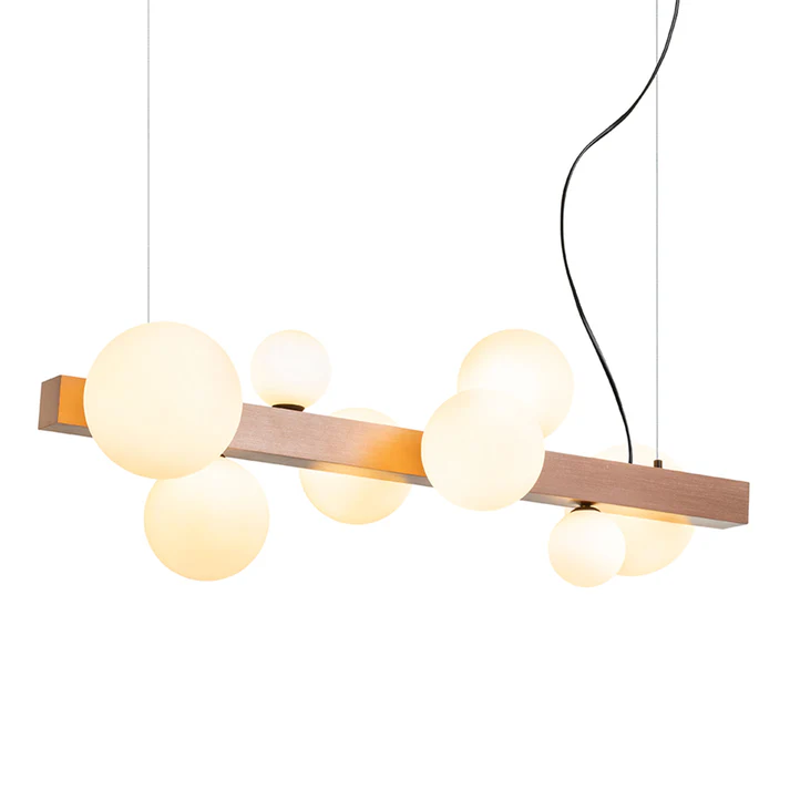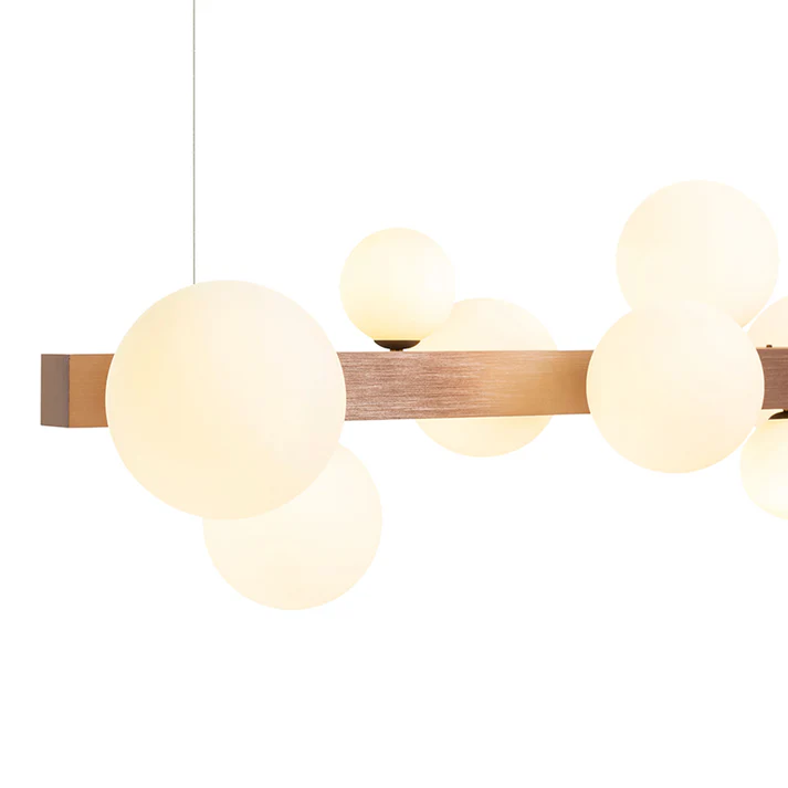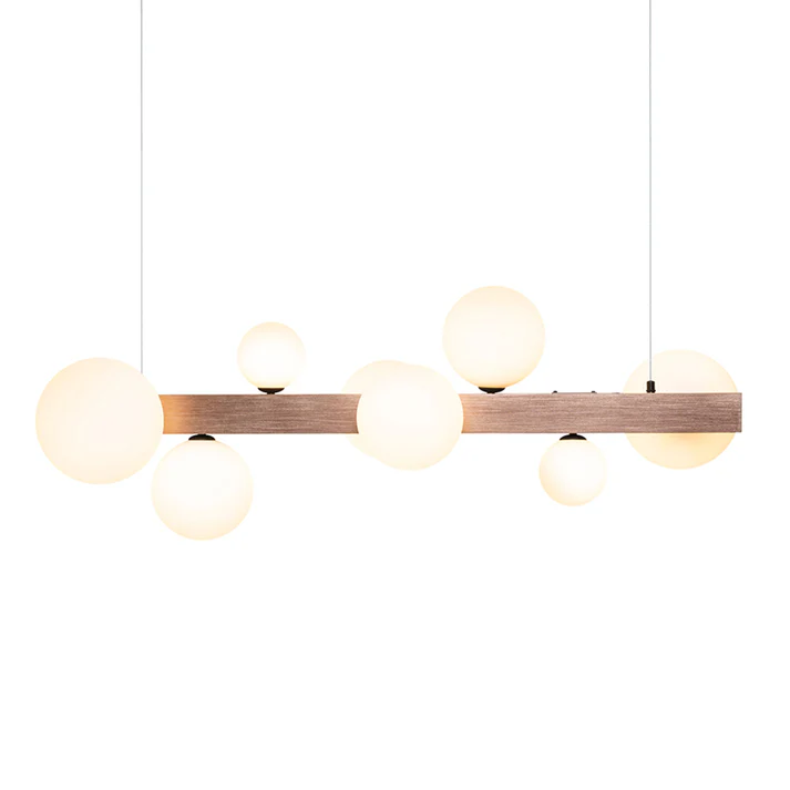 Pendulul KASSANDRA este o piesă de design spectaculoasă, ce îmbină eleganța sticlei opal cu rafinamentul finisajului bronz periat. Cele opt abajururi rotunde, realizate din sticlă mată în trei dimensiuni diferite, sunt dispuse armonios pe o prismă metalică, creând un efect vizual sofisticat și modern. Compatibil cu surse de lumină LED G9, acest corp asigură o iluminare plăcută și uniformă, ideală pentru livinguri, zone de dining sau spații de socializare cu personalitate. Suspensia ajustabilă până la 115 cm permite integrarea ușoară atât în interioare cu tavane standard, cât și în încăperi ample. Cu o greutate de 3250 g, pendulul impresionează prin robustețe și calitatea execuției, fiind o alegere inspirată pentru cei care caută un corp de iluminat decorativ cu impact vizual și funcționalitate ridicată. Dimensiuni: L 99 × H max. 115 cm.