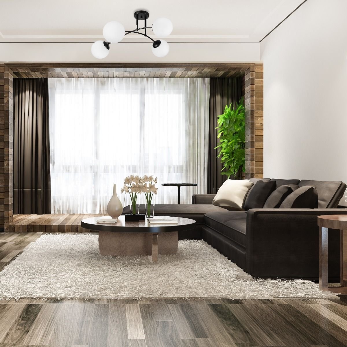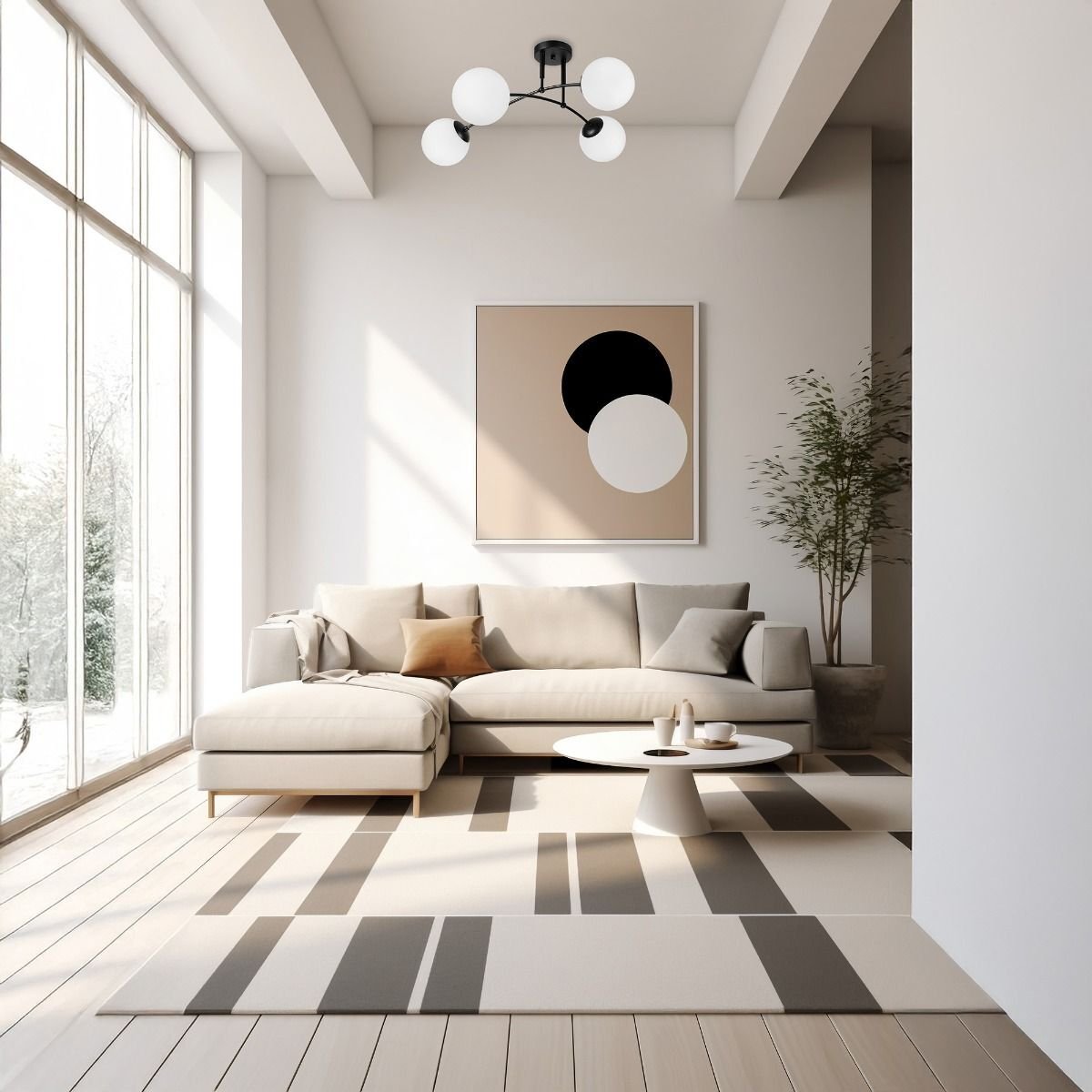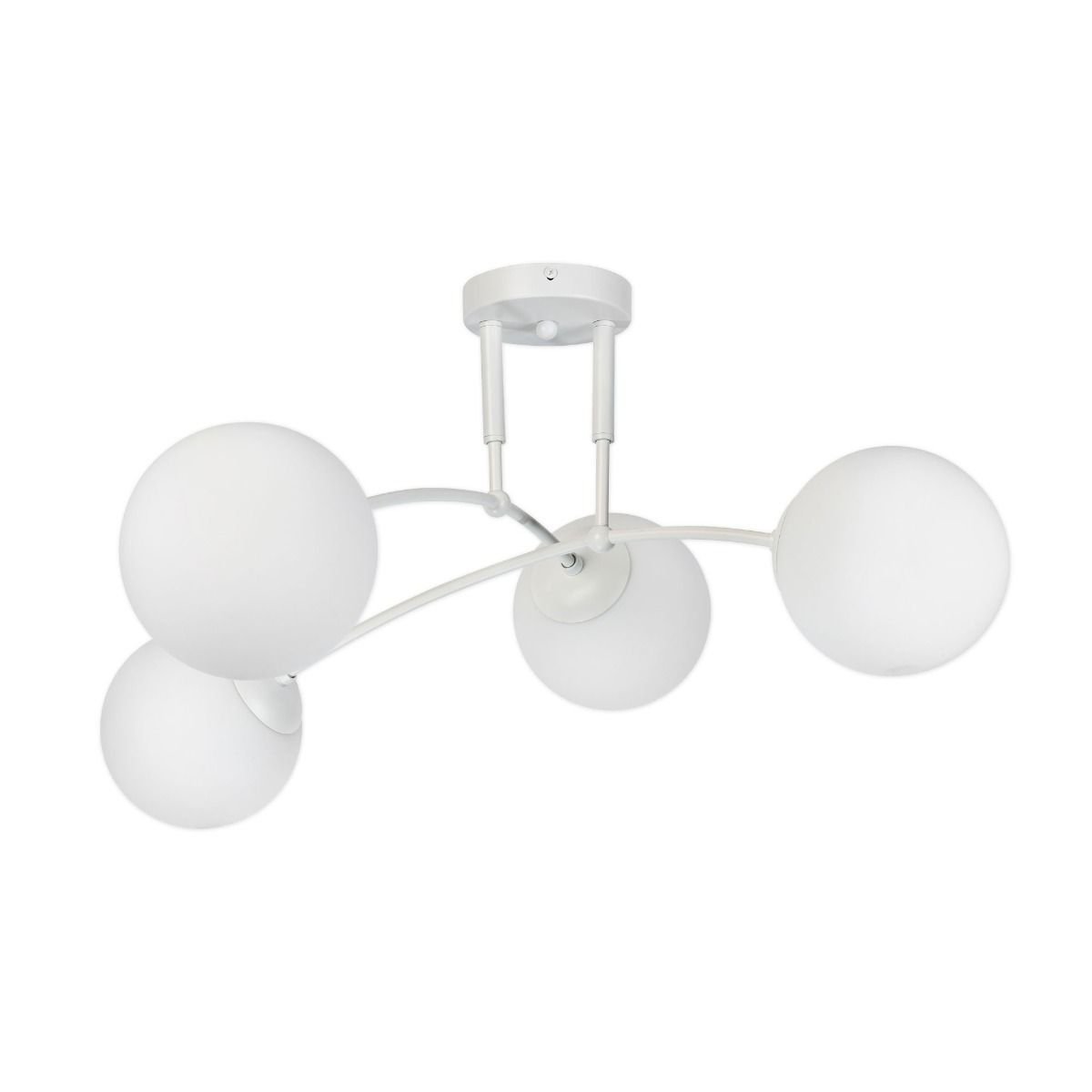 Plafonieră modernă pentru interior, cu 4 surse de iluminare, realizată din metal și sticlă, potrivită pentru livinguri sau spații contemporane.